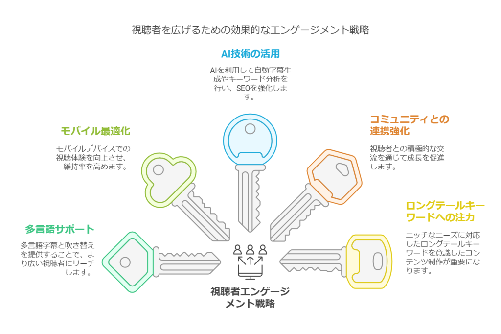 | 多言語対応 | 多言語字幕や吹き替えを提供することで、より多くの視聴者にリーチできます。 |