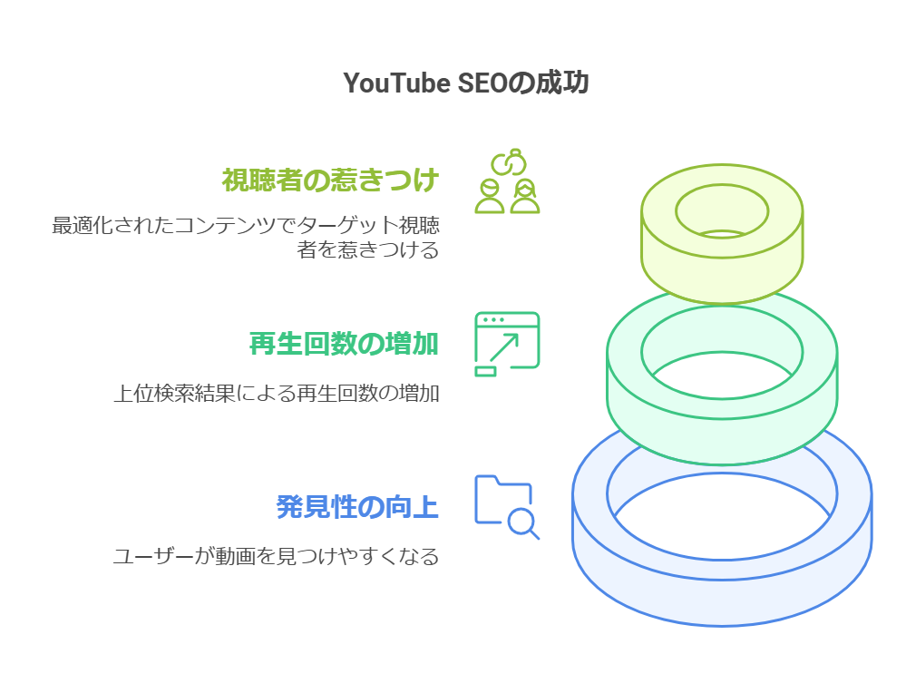 - 再生回数を増やすため:動画が検索結果の上位に表示されれば、より多くのユーザーの目に触れ、クリック率や再生回数の向上に繋がります。再生回数の増加は、チャンネルの成長、収益化、ブランド認知度の向上に大きく貢献します。