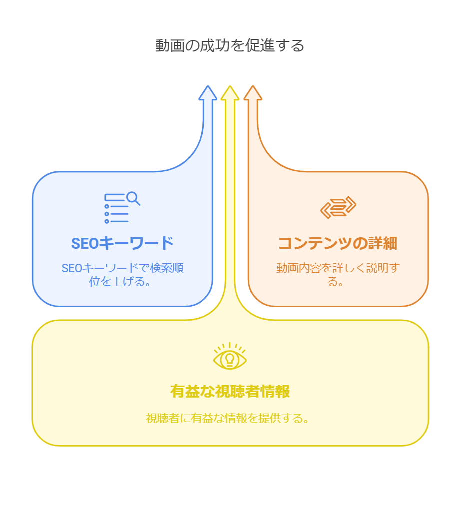 説明文は、動画の内容を詳しく説明するだけでなく、キーワードを含めることでSEO対策にも効果を発揮します。また、視聴者にとって有益な情報を提供することで、視聴維持率の向上にも繋がります。