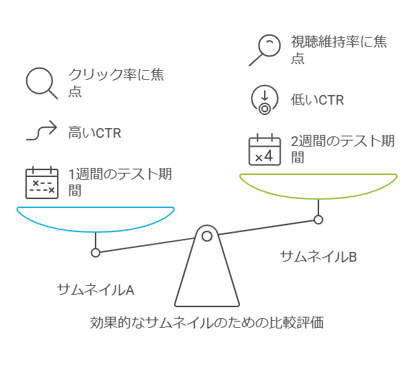 作成したサムネイルが本当に効果的かどうかを検証するために、A/Bテストを実施することが重要です。A/Bテストとは、異なるバージョンのサムネイルを比較し、どちらがより高いCTRを獲得するかを検証する手法です。YouTubeでは、YouTube StudioでサムネイルA/Bテストを実施できます。異なるデザインのサムネイルを複数用意し、一定期間表示させてクリック率を比較することで、最適なサムネイルを特定できます。