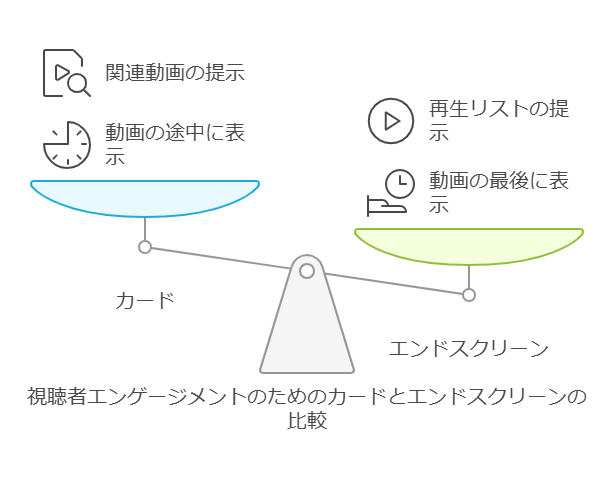 カードやエンドスクリーンは、視聴者に他の動画やチャンネル登録を促す効果的なツールです。視聴維持率の向上やチャンネル登録者数の増加に繋がり、結果として動画の再生回数増加に貢献します。カードは動画の途中に、エンドスクリーンは動画の最後に表示され、視聴者の行動を促す効果的な仕掛けとして活用できます。