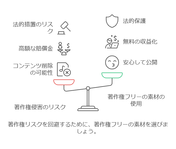 著作権保護された楽曲や効果音を許可なく使用すると、著作権侵害となり深刻な問題を引き起こす可能性があります。