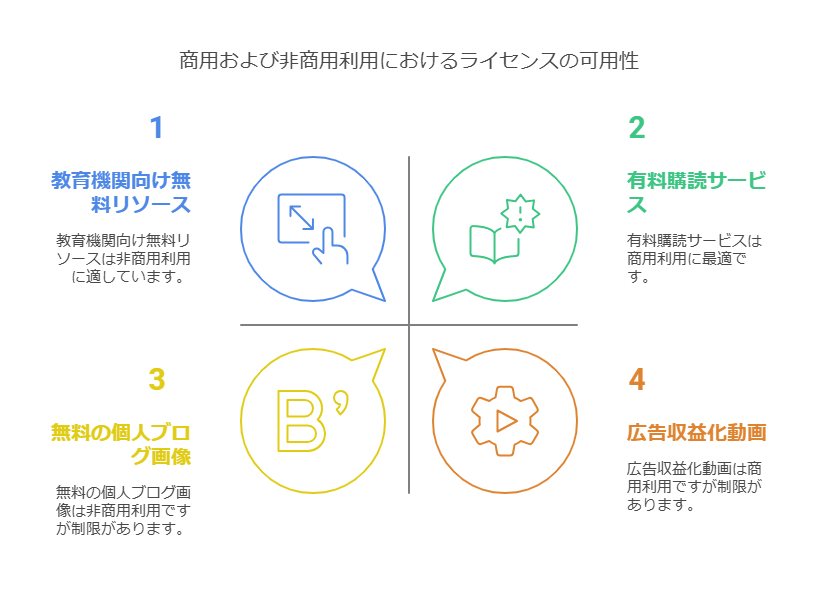 多くの著作権フリー素材サイトでは、商用利用可能なライセンスと非商用利用のみ許可されたライセンスを分けて提供しています。クリエイティブ・コモンズのようなライセンス体系では、NC(非営利)の表記がある素材は商用利用できません。