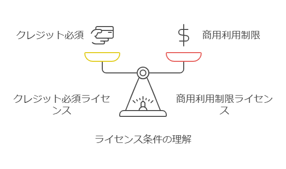 ただし、商用利用可能でも、素材によって追加条件(クレジット表記の必要性など)が設定されていることが多いため、各サイトのライセンス条項を必ず確認することが重要です。