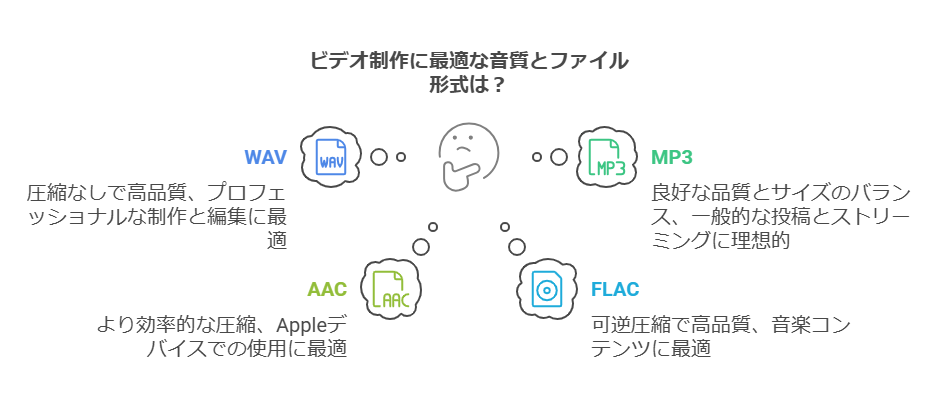 著作権の次に確認すべきは、素材の音質とファイル形式です。動画のクオリティを左右する重要な要素となります。