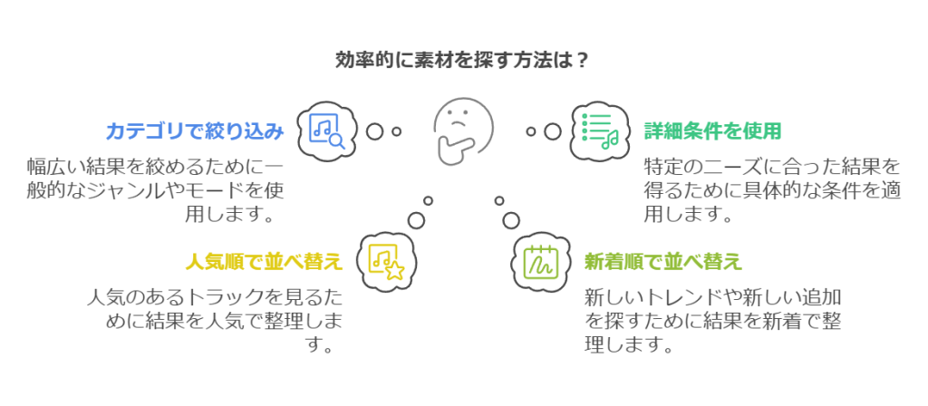 効率的な素材探しのコツは、まず大まかなカテゴリで絞り込み、次に細かい条件で検索することです。例えば「明るいピアノ曲で2分程度の長さ」というように具体的な条件を組み合わせると、理想の素材に素早くたどり着けます。