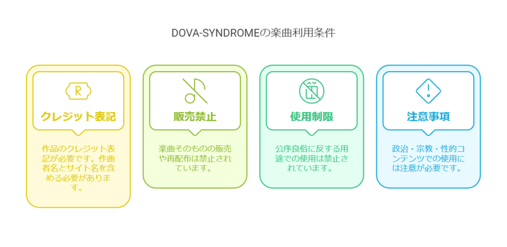 詳細な利用規約はDOVA-SYNDROMEの利用規約ページで確認できます。個別の楽曲ページにも利用条件が記載されていますので、使用前に必ず確認しましょう。