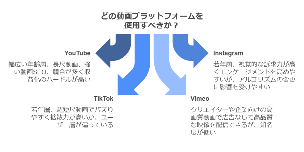 YouTube、Instagram、TikTok、Vimeo、それぞれのプラットフォームが持つ特徴を比較し、最適な選択肢を見つけましょう。