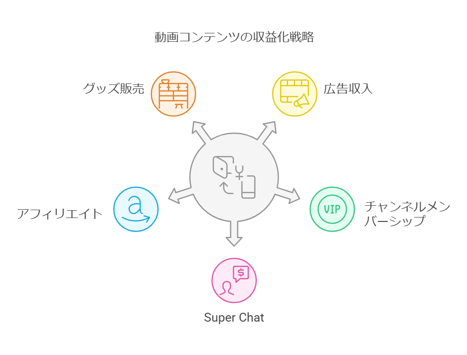 | グッズ販売 | 自分のチャンネルのオリジナルグッズを販売する | ブランドイメージの向上、ファンとの一体感を高めることができる | グッズの企画・制作・販売の手間がかかる、在庫管理が必要 |