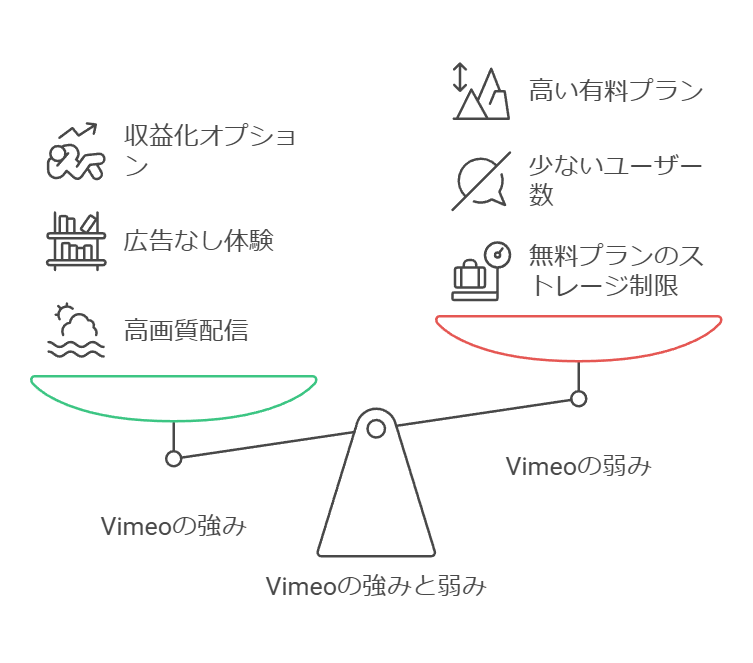 | Vimeo | クリエイター、企業 | 高画質動画 | 広告なしで高品質な映像を配信できる、プロフェッショナルなユーザーが多い | ユーザー数が少ない、YouTubeに比べて知名度が低い、他のプラットフォームに比べて情報が少ない |