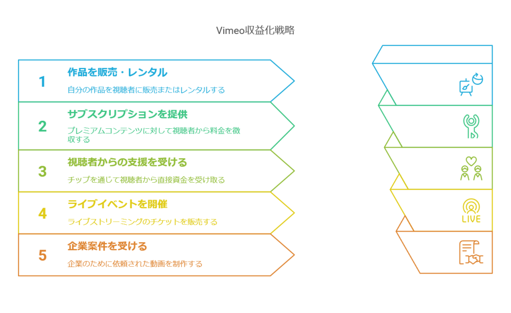 | 収益化方法 | YouTube | TikTok | Vimeo | |