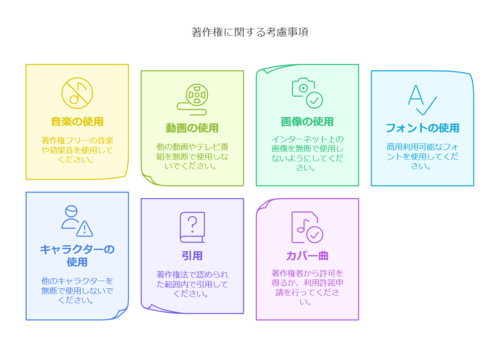 著作権侵害、不適切なコンテンツの配信、プライバシー侵害など、注意すべき点が多くあります。