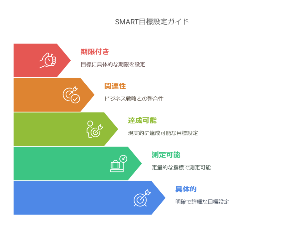 SMARTの法則とは、以下の5つの要素を満たす目標設定の方法です。