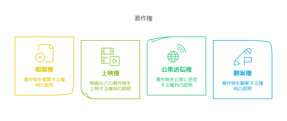 複製権とは、著作物を複製する権利です。例えば、動画をコピーしたり、ダウンロードしたりすることは複製権の侵害にあたります。上映権とは、映画などの著作物を上映する権利です。公衆送信権とは、著作物を公衆に送信する権利で、インターネット上で動画を配信することもこれに該当します。他にも、改変、翻訳、翻案なども著作権侵害となる可能性があります。