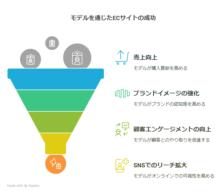 ECサイトで商品を販売する際、モデルを起用することは様々なメリットをもたらします。売上向上への直接的な貢献だけでなく、ブランドイメージの確立や顧客エンゲージメントの向上など、多角的な効果が期待できます。特に、競争が激化する現代のEC市場においては、モデル起用は他社との差別化を図り、成功を掴むための重要な戦略と言えるでしょう。