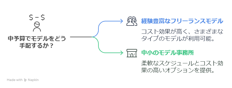 中小事務所に所属するモデルは、大手事務所に比べて費用が抑えられる場合があります。また、対応が柔軟な事務所も多いため、撮影のスケジュール調整などがスムーズに行える可能性があります。事務所の評判や実績を確認し、信頼できる事務所を選ぶことが重要です。