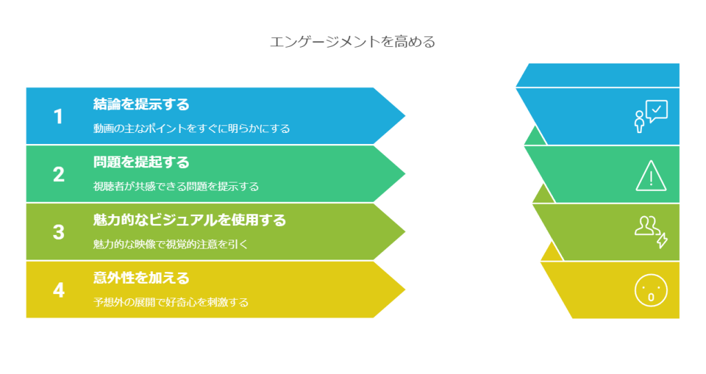 - 結論ファースト:動画で伝えたい結論を最初に提示することで、視聴者の興味を引きつけます。