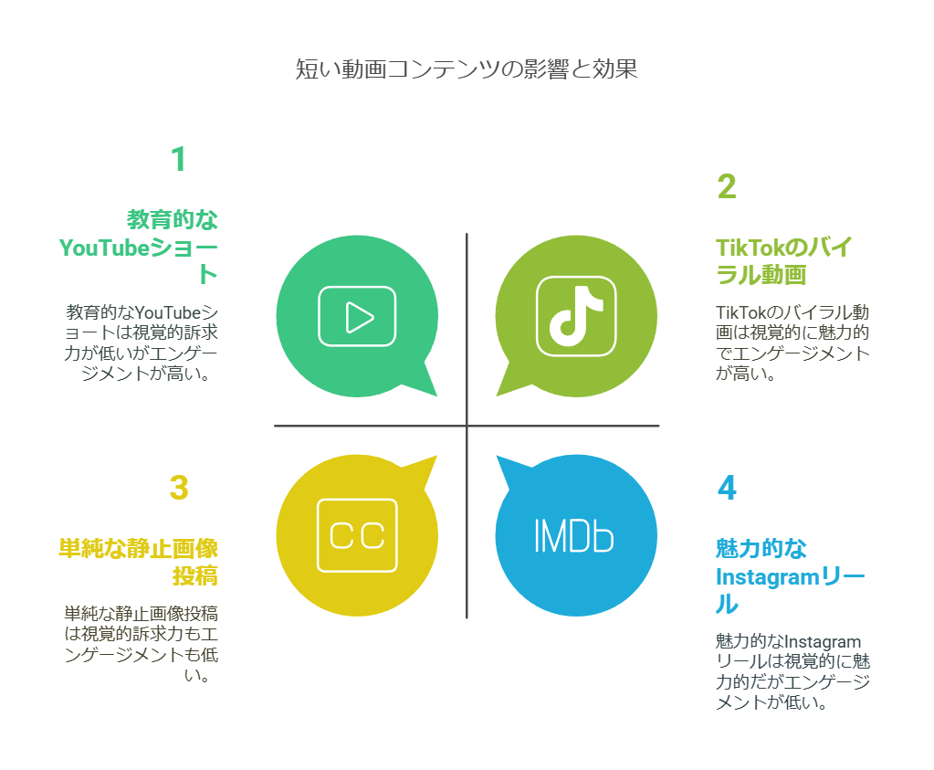 ショート動画を制作・配信することで、様々な効果が期待できます。主な効果として下記が挙げられます。