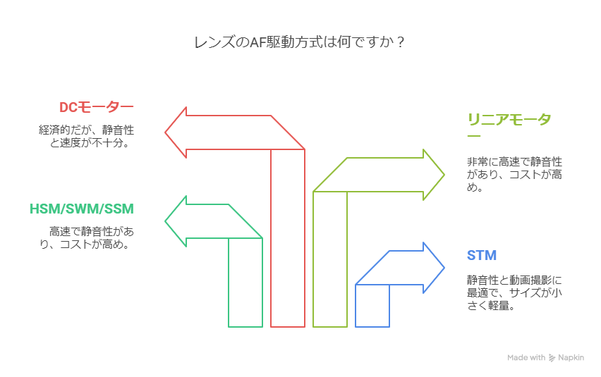 レンズのAF駆動方式は、静音性だけでなく速度や精度にも影響を与えます。主なAF駆動方式とその特徴を理解することで、最適なレンズ選びが可能になります。