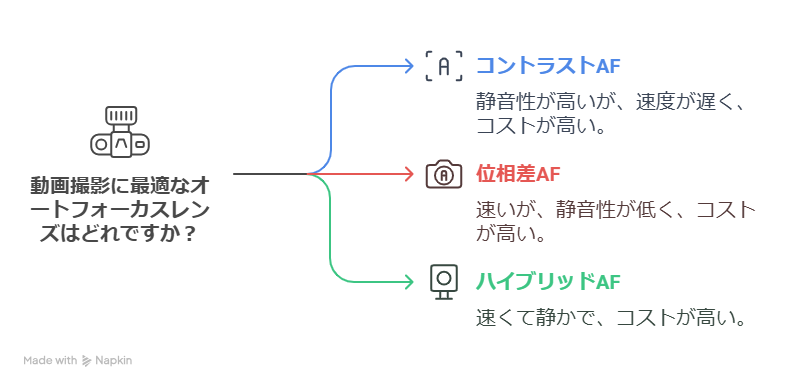 動画撮影において、静音性に優れたAFを持つレンズを選ぶことは、高品質な映像制作に不可欠です。本項では、レンズの種類とAF方式、そして動画撮影のジャンルに合わせたレンズ選択のポイントを解説します。