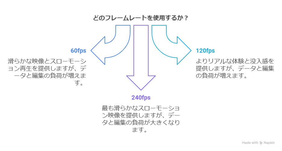 フレームレートは映像表現において非常に重要な要素であり、表現したい雰囲気や目的に合わせて適切なフレームレートを選択することが大切です。上記で挙げたメリット・デメリットを踏まえ、最適なフレームレートを選定しましょう。