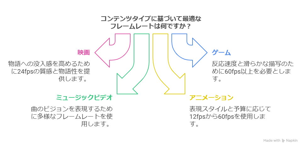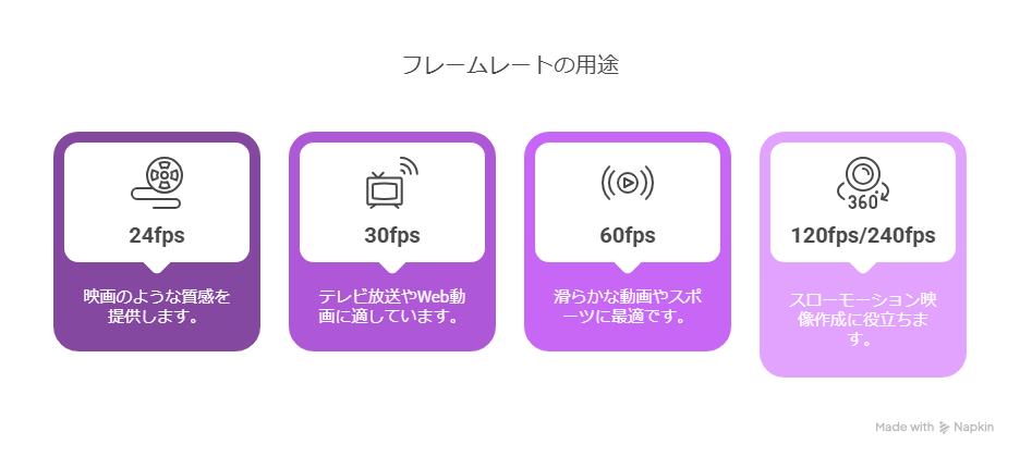 このように、フレームレートは映像作品の種類や表現意図によって最適な値が異なり、映像の質感や視聴体験に大きな影響を与えます。それぞれの特性を理解し、効果的に活用することで、より魅力的な映像表現が可能になります。