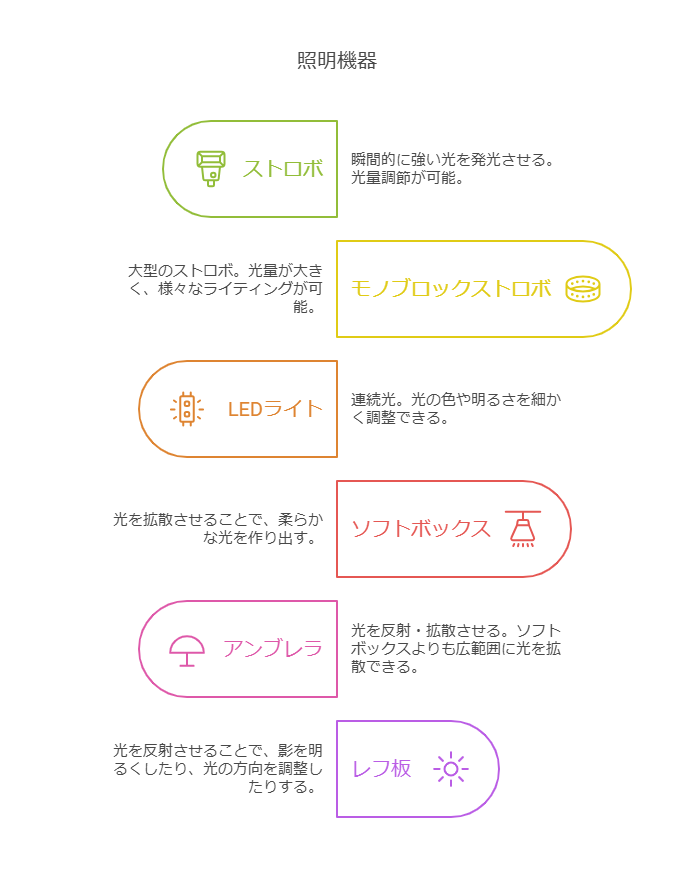 スタジオ撮影において、照明は写真の仕上がりを左右する重要な要素です。自然光だけでなく、様々な照明機材が用意されているスタジオを選ぶと、より幅広い表現が可能です。