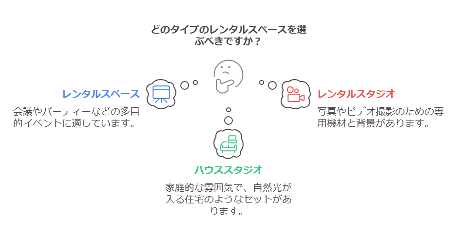 「レンタルスペース」「レンタルスタジオ」「ハウススタジオ」は混同されがちですが、それぞれ異なる特徴を持っています。以下の表で違いを整理してみましょう。