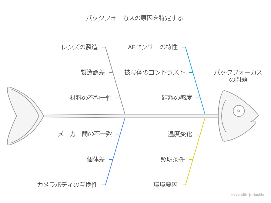 - 光学的なバックフォーカス:レンズの製造誤差や、カメラボディとの相性によって発生する物理的なズレ。AFセンサーと撮像素子の位置関係の誤差、レンズ内の光学系の特性などが原因となる。