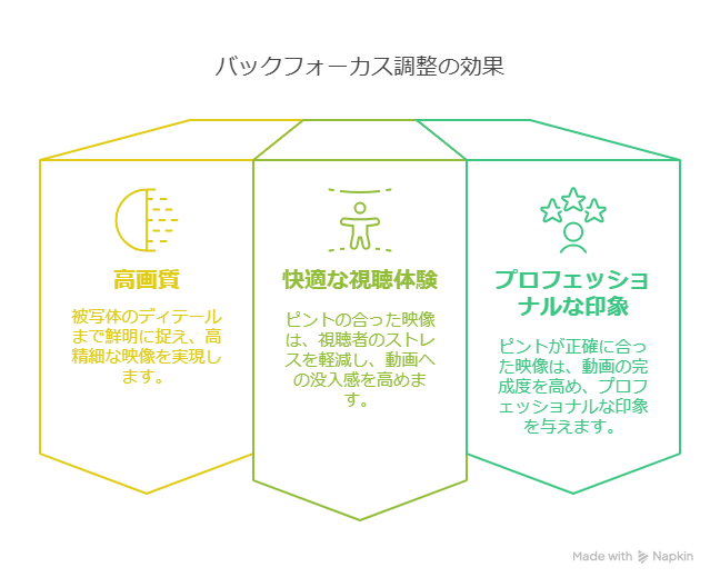 動画撮影において、バックフォーカス調整は画質の向上、視聴体験の向上、そしてプロフェッショナルな映像制作に直結する非常に重要な要素です。ピントが合ったクリアな映像は、視聴者に快適な視聴体験を提供し、動画のメッセージを効果的に伝えることができます。逆に、ピントがずれた映像は、視聴者の集中力を削ぎ、動画全体の質を低下させてしまいます。バックフォーカス調整を適切に行うことで、これらの問題を回避し、高品質な動画を制作することが可能になります。