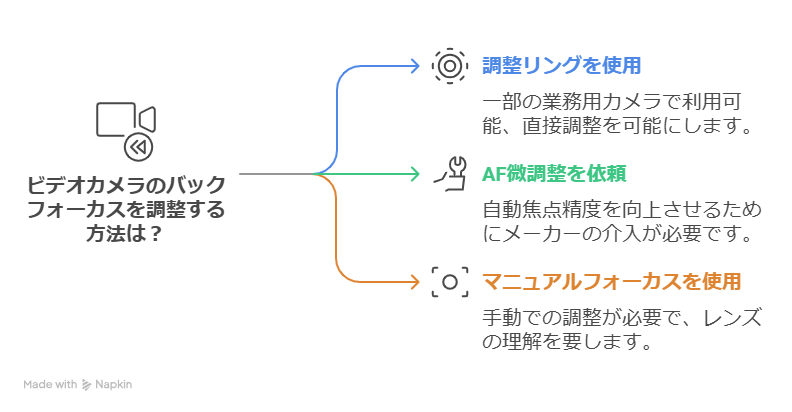 ビデオカメラのバックフォーカス調整は、機種によって大きく異なります。一部の業務用ビデオカメラでは、レンズに調整用のリングが備わっている場合がありますが、多くの民生用ビデオカメラでは、AF微調整機能が搭載されていないか、搭載されていても調整範囲が限られています。メーカーに調整を依頼するか、マニュアルフォーカスで対応する必要がある場合もあります。
