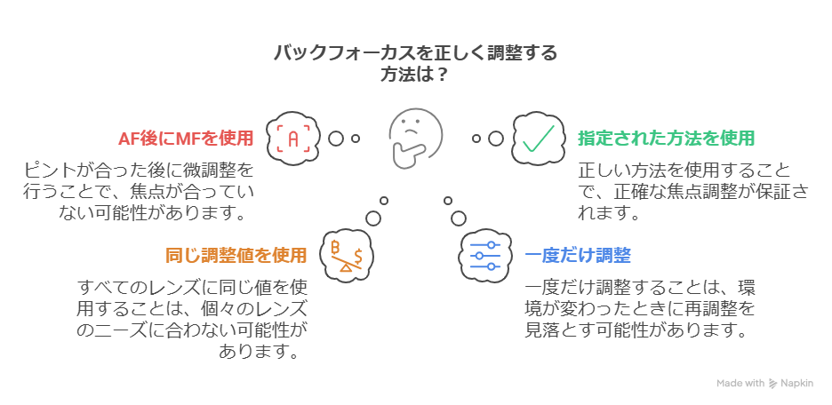 バックフォーカス調整の方法を正しく理解していないと、適切な調整ができません。以下の点に注意しましょう。