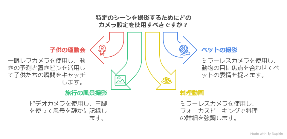動画撮影において、バックフォーカス調整はシーンによって最適な方法が異なります。ここでは、様々なシーンに合わせたバックフォーカス調整のテクニックを解説します。